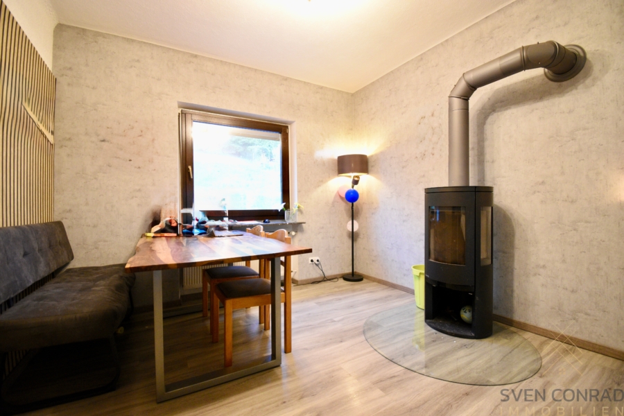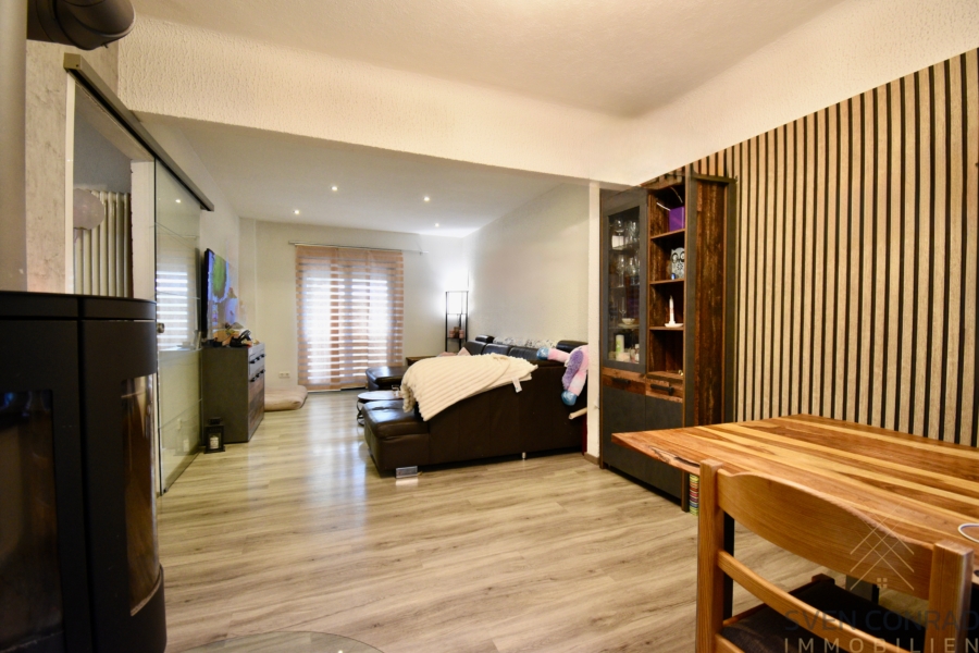 Auf einer Wohnfläche von ca. 120 m², verteilt auf zwei Wohnebenen, eröffnet sich Ihnen ein durchdachtes Raumkonzept mit vielseitigen Nutzungsmöglichkeiten. Bereits beim Betreten des Erdgeschosses empfängt Sie eine einladende Atmosphäre mit offen gestaltetem Wohnbereich und gemütlichem Kamin, der besonders in den kühleren Monaten für wohlige Wärme sorgt. Die angrenzende Küche inklusive Einbauküche sowie ein Badezimmer runden diese Ebene funktional ab. Ein besonderes Highlight ist der großzügige Wintergarten, der direkt vom Wohnbereich aus zugänglich ist und Ihnen zu jeder Jahreszeit einen beeindruckenden Blick in die Umgebung ermöglicht. Hier lassen sich entspannte Stunden mit Familie und Freunden verbringen. Im Obergeschoss erwarten Sie drei gut geschnittene Schlafzimmer sowie ein weiteres Badezimmer, wodurch sich das Haus ideal für Familien eignet. Das vollunterkellerte Untergeschoss bietet zusätzliche Nutzfläche, vielseitige Abstellmöglichkeiten und direkten Zugang zum Garten sowie zur Garage.