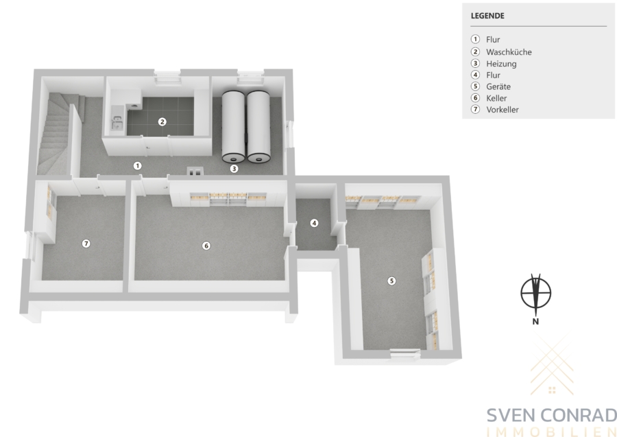 Im Kellergeschoss finden sie mit mehreren Räumen (darunter u. a. der Hauswirtschaftsraum) reichlich Nutzfläche, um beispielsweise Lager- oder Hobbyinteressen zu verwirklichen. Ferner bietet der Speicher eine weitere Option die Immobilie zu erweitern und weiteren Wohnraum zu generieren.