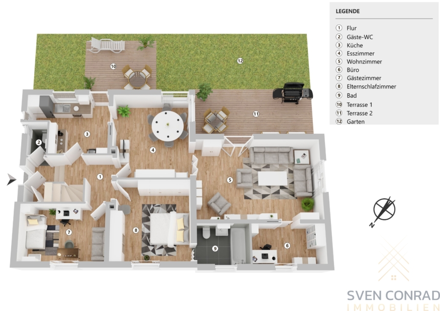 Erdgeschoss: – Eingangsbereich – Flur – Wohn-/Esszimmer (Zugang Terrasse) – Küche (Zugang Terrasse) – Schlafzimmer 1 mit Badezimmer (Badewanne|WC) – Schlafzimmer 2 – Büro – Gäste-WC – Terrasse