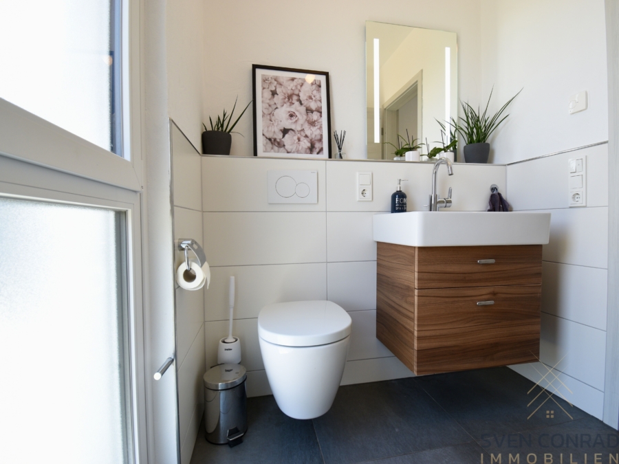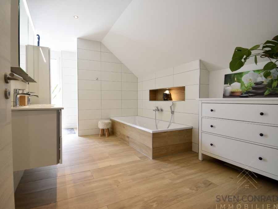 Die mit Geschmack geplanten Bäder bieten jeweils bodenebene Duschen, eine Badewanne (DG) und sind mit dem entsprechend abgestimmten Mobiliar versehen. Desweiteren sind im gesamten Anwesen elektrische Rollläden und bodentiefe Fenster angebracht.