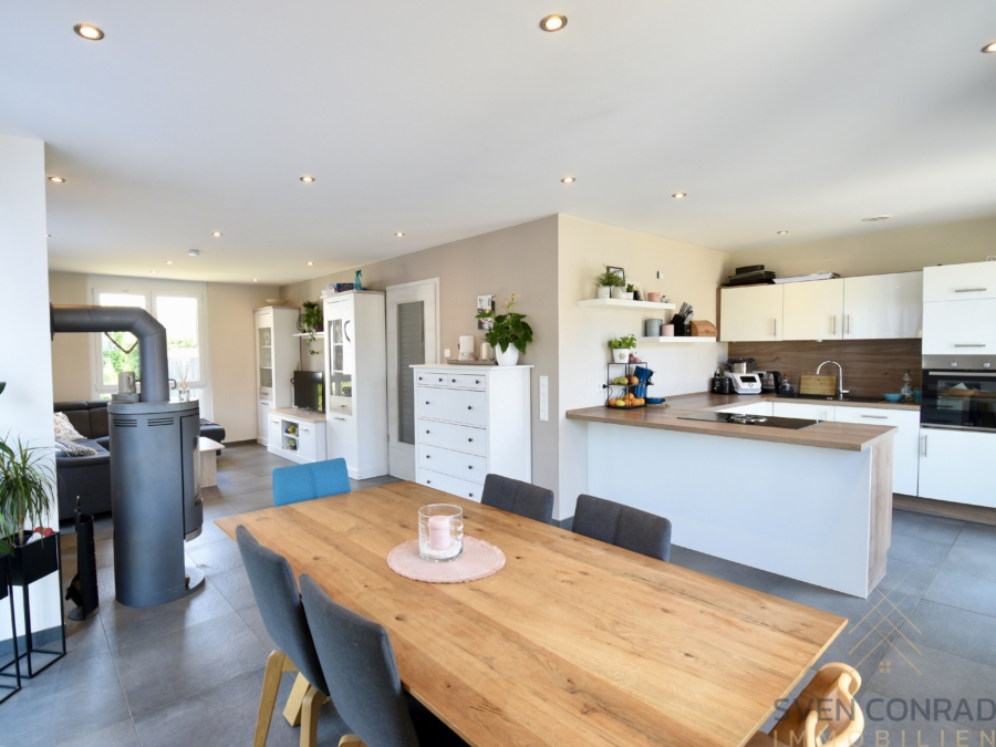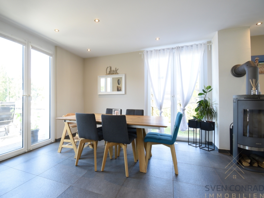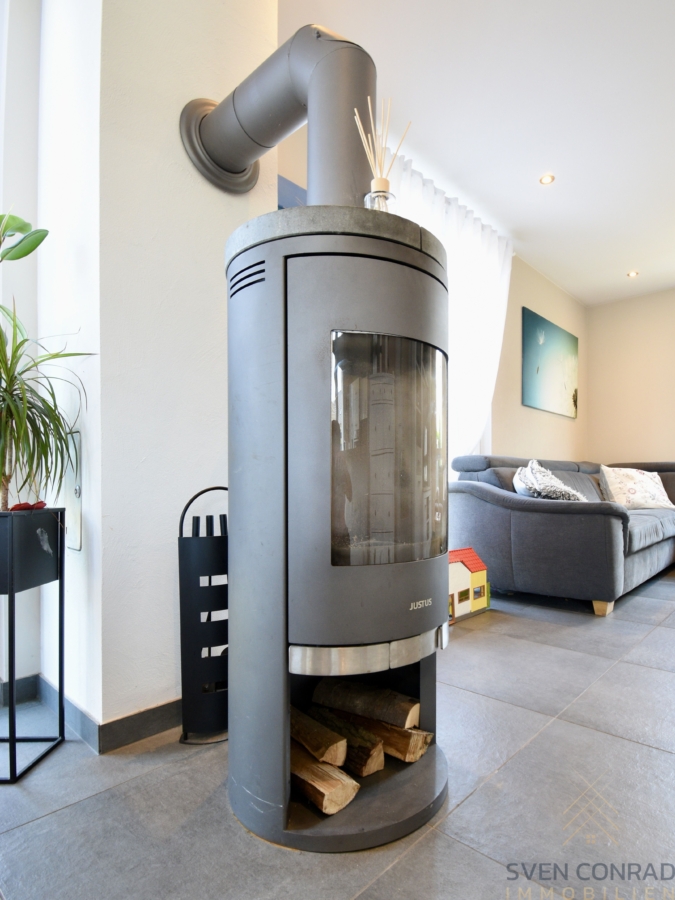 Das Wohnanwesen mit seinen ca. 128 m² Wohnfläche verteilt sich im Erd- sowie dem Dachgeschoss auf insgesamt 5 Zimmer, darunter 4 Schlaf-/Kinderzimmer, 2 Bäder und 1 Küche. Im großen offen gestalteten Wohn-/Essbereich wurde zudem ein Kaminofen (Brennstoff: Holz) integriert, welcher seinen Teil zum gemütlichen Wohnklima beiträgt.