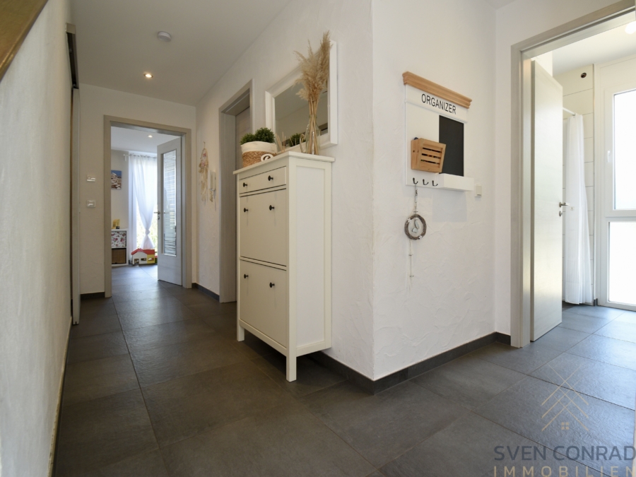 Dieses auf einem ca. 520 m² großen Grundstück befindliche im Jahr 2018 in massiver Bauweise errichtete freistehende Einfamilienhaus befindet sich im Neubaugebiet "Auf der Burg" in Merxheim. Das neuwertige Eigenheim wurde als Energieeffizienzhaus KfW 55 konzipiert und ist dementsprechend energetisch auf TOP-Niveau und für die grüne Zukunft bestens gerüstet. So ist beispielsweise eine hochwertige Lüftungsanlage installiert, das gesamte Haus mit einer Fußbodenheizung ausgestattet und Solarkollektoren zur Warmwasserbereitung auf dem Dach verbaut.
