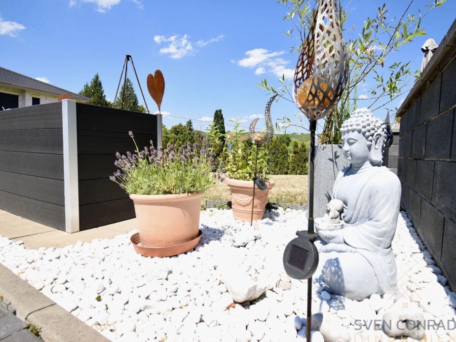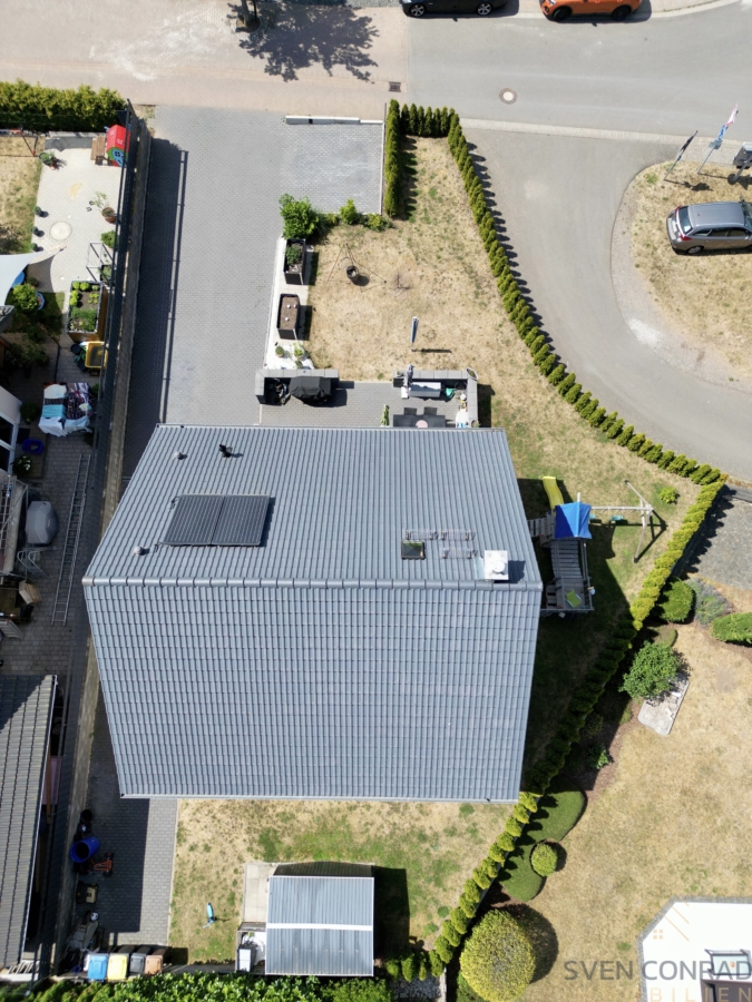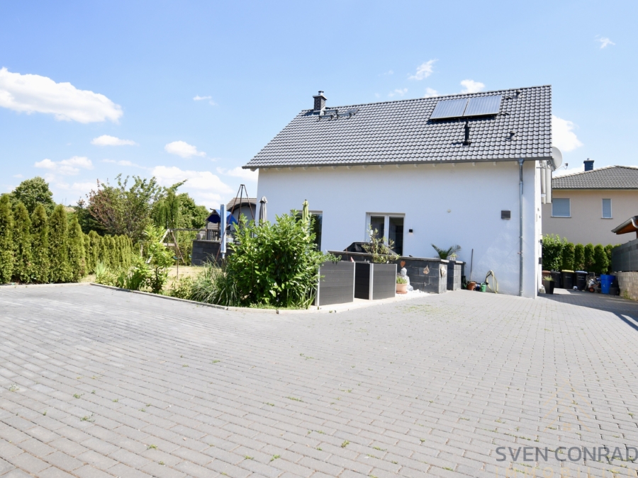 Die bereits fertig gestellte Außenanlage bietet neben einer um das Haus verlaufenden Grünfläche, eine gepflasterte abgegrenzte Terrasse, sowie einen großen Zufahrtsweg auf dem mühelos 3 Fahrzeuge Platz zum Abstellen finden. Auf dem Außengelände bieten sich zahlreiche Nutzungsmöglichkeiten, wie beispielsweise aktuell das Aufstellen eines Klettergerüsts für Kinder.