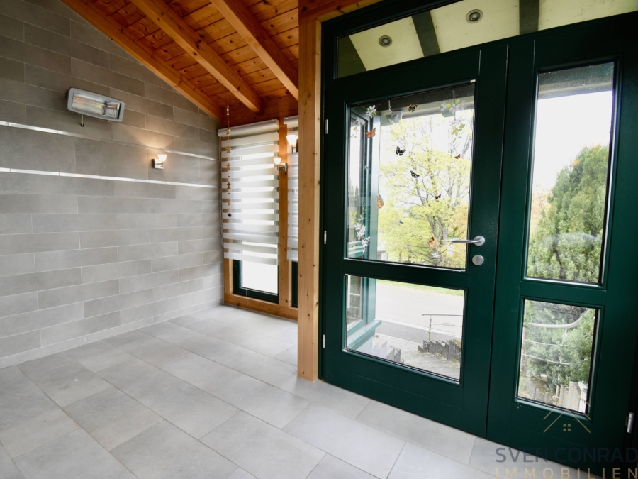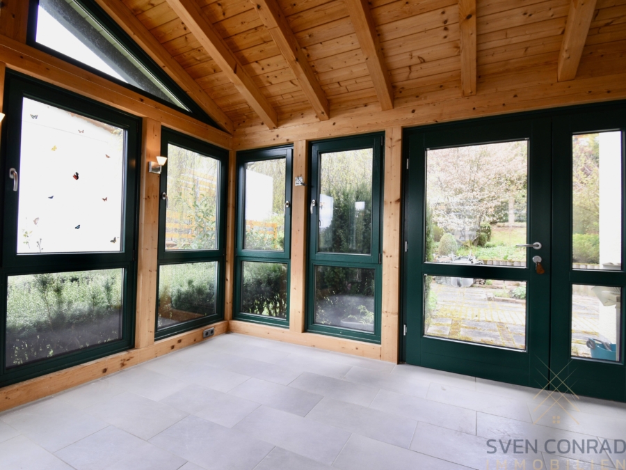 Der als Eingangsbereich errichtete Wintergarten, welcher auch einen direkten Zugang zur Terrasse/Gartenlandschaft bietet, wurde mit massiven Holzelementen bzw. modernen Fliesen errichtet, wodurch man bereits beim Betreten des Wohnanwesen das tolle Wohnambiente spüren kann.