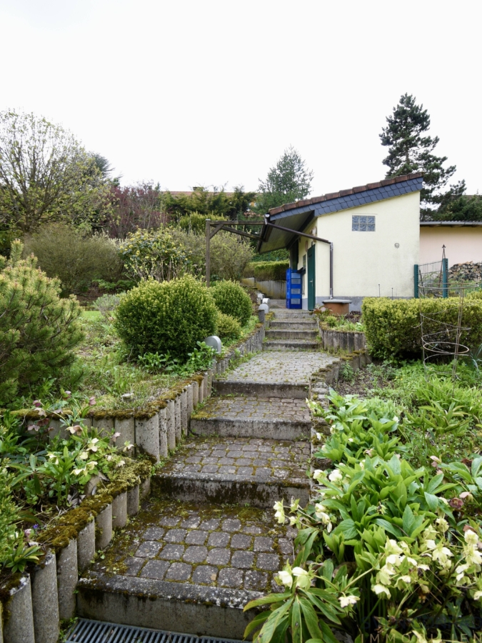 Von der Wohnebene (Erdgeschoss) aus erreichen Sie die hinter dem Haus befindliche gepflasterte zum Teil überdachte Terrasse von wo aus man die Grünanlage betritt. Diese wurde im Jahr 2003 gänzlich neu auf mehrere Ebenen angelegt und besteht aus Grünflächen, einem tollen Baumbestand und einem durchführenden gepflasterten Weg.
