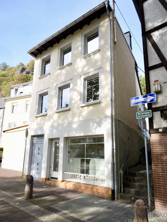 Highlights: – Kernsanierung in 2004 – tolle Lage – direkt bezugsfertig – gepflegtes Anwesen – großer Wohnbereich mit Kamin – Dachterrasse mit Blick zur Felsenkirche – innenliegende Terrasse mit Grillstelle – zusätzliche Gewerbefläche (Ladenlokal)
