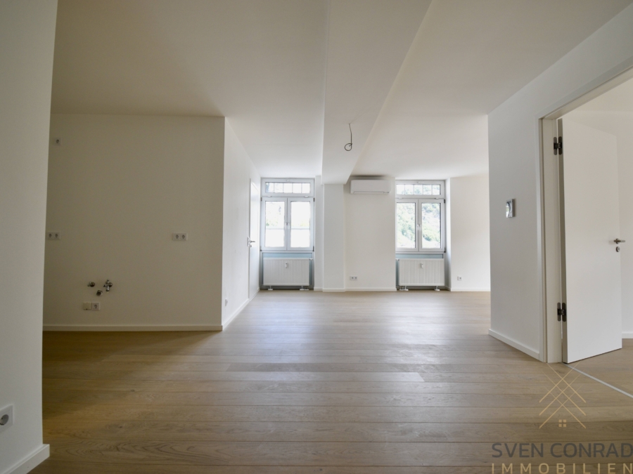 Die Wohnung hält insgesamt ca. 79 m² Wohnfläche für Sie bereit und ist barrierefrei über einen Aufzug, wie auch über das im 3. OG befindliche Parkdeck, zu erreichen. Neben dem offen gestalteten Wohnraum bietet der freie Blick auf die Felsenkirche einen besonderen Flair.